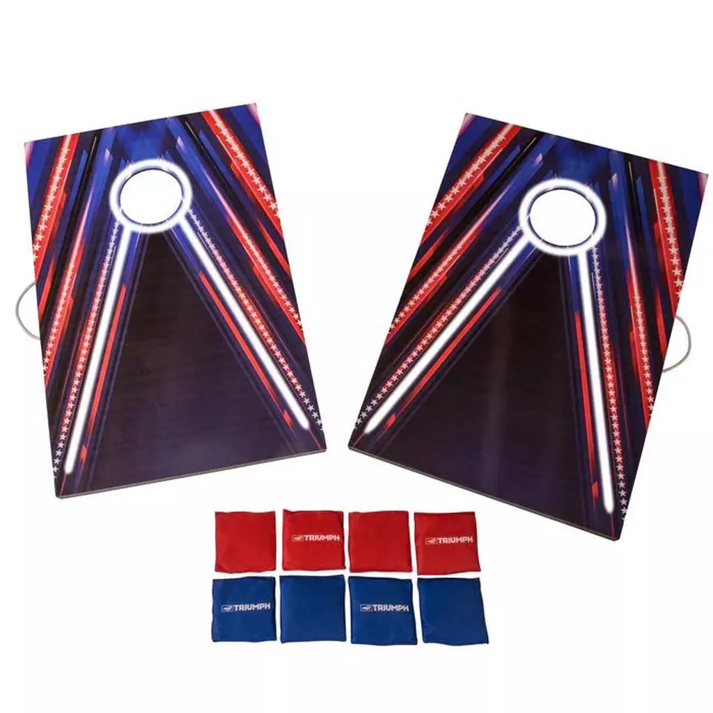 - Keep the game going long after the sun sets with the Triumph LED Keyhole Cornhole Set. This set includes two LED 2x3 cornhole boards and eight all-weather knitted cornhole bags. Eight AA batteries are required, but not included. This set’s knitted bags are light and easy to throw, providing hours of fun and feature all-weather filling, ensuring durable outdoor play. Once the party’s over, combine the boards with their Velcro fasteners and store the bags inside. Use the convenient carry handle to take this set anywhere from beach to barbecue.